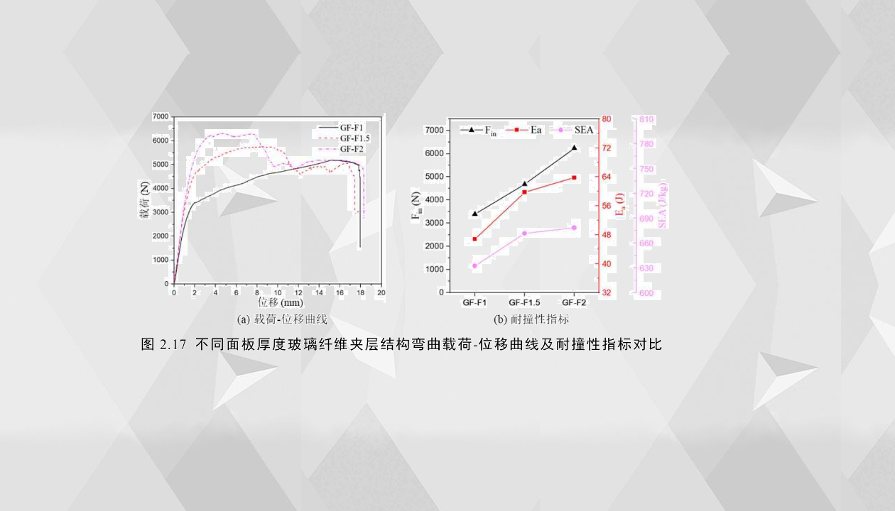 2.4.1面板對結構耐撞性能影響——E圖2.17(a)比較了不同面板厚度玻璃纖維夾層結構的載荷-位移曲線,可以看出,三者都屬于曲線類型Ⅲ,GF-F1與GF-F1.5的臨界失效模式為壓痕壓入(IN),其發生臨界失效之后載荷并沒有下降,只是增加幅度減少,這和CF-F1類似。GF-F1從加載開始到試件整體完全失去承載能力,未出現明顯的較為緩慢的載荷下降。與GF-F1不同的是,GF-F1.5在彎曲位移9mm左右時,還出現芯層剪切裂紋以及后續的界面失效,載荷下降較多。GF-F2的臨界失效模式出現芯層剪切(CS)和壓痕壓入(IN)兩者的組合,在出現失效后的小段位移內,載荷沒有明顯下降趨勢,而是基本保持相對恒定;當加載位移繼續增加,出現明顯的芯層裂紋以及后續的界面失效,載荷顯著降低,這與GF-F1.5的后屈曲失效機理相似。