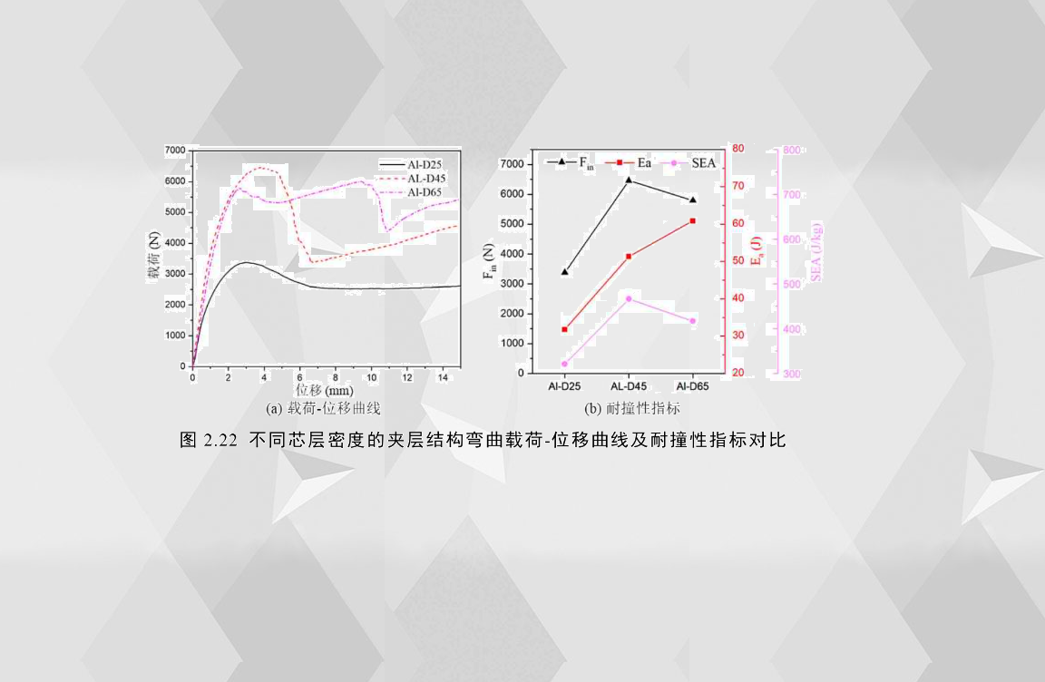 對(duì)不同芯層密度的鋁合金夾層結(jié)構(gòu)而言,其載荷-位移曲線和壓潰過(guò)程差別較大,如圖2.22(a)所示,芯層密度為0.25g/cm3的AL-D25和芯層密度為0.45g/cm3的AL-D45的載荷-位移曲線屬于類(lèi)型I,芯層密度為0.65g/cm3的AL-D65的屬于類(lèi)型Ⅱ,AL-D25的臨界失效模式為芯層剪切(CS),臨界載荷最小,由于其芯層密度較低,其后期主要失效形式還是以剪切裂紋為主,后屈曲壓潰力與臨界失效載荷相比相差不大。AL-D45的臨界失效模式也為芯層剪切(CS),其臨界載荷是三者中最大的,在臨界失效之后小段位移耦合了下界面失效,其載荷下降很快,嚴(yán)重降低了試件吸能。值得注意的是,雖然AL-D65的芯層密度比AL-D45的大,芯層可以承受的剪切強(qiáng)度大,但AL-D65的芯層的平均胞元大小比AL-D45的小,界面的強(qiáng)度比AL-D45的小,而在加載過(guò)程AL-D65的界面能承受的剪切強(qiáng)度比芯層能承受的剪切強(qiáng)度小,所以發(fā)生了界面分離的臨界失效模式,使得AL-D65的臨界載荷反而比后者的小。雖然AL-D65在彎曲位移2.5mm左右處發(fā)生界面失效,但其失效界面的位置為上膠層,位移相對(duì)較小,試件整體的承載能力還很強(qiáng),所以其載荷下降的幅度比例相對(duì)AL-H10更小,所以前者的吸能效果更佳。